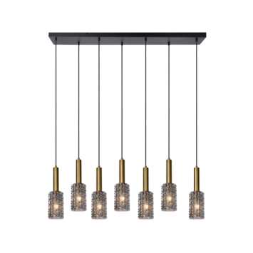 De Lucide hanglamp Coralie is exclusief voor de E27 lichtbron. De plafondplaat heeft 7 lichtpunten, elk in hoogte verstelbaar tot 150 cm. Zo kan je zelf variëren in lengtes en een uniform of speels effect creëren. Het glas van de hanglamp heeft een bepaalde structuur en heeft de kleur mat goud / messing. Omdat bij de hanglamp de lichtbron niet wordt meegeleverd, kan jezelf kiezen voor een dimbare lichtbron. Met een externe dimmer kan je deze vervolgens dimmen. De hanglamp heeft een afmeting van 132x25x150 cm (lxbxh).