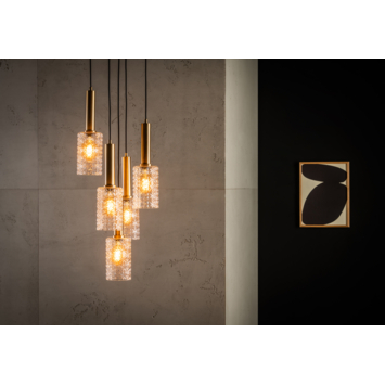 De Lucide hanglamp Coralie is exclusief voor de E27 lichtbron. De plafondplaat heeft 5 lichtpunten, elk in hoogte verstelbaar tot 150 cm. De lampenkap heeft een diameter van 30 cm. Zo kan je zelf variëren in lengtes en een uniform of speels effect creëren. Het glas van de hanglamp heeft een bepaalde structuur en heeft de kleur transparant. Omdat bij de hanglamp de lichtbron niet wordt meegeleverd, kan jezelf kiezen voor een dimbare lichtbron. Met een externe dimmer kan je deze vervolgens dimmen.