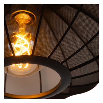 Een hele mooie vorm lamp gemaakt van mooi materiaal.Hangt erg sjiek boven de eettafel door dat hij goud met zwart is.
