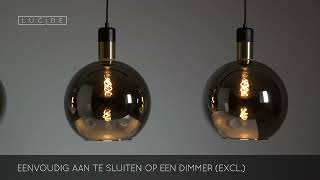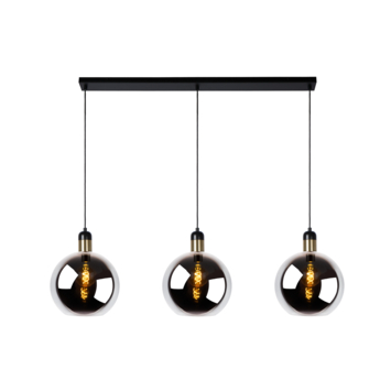 De Lucide hanglamp Julius 3x40W fumé is een glazen hanglamp met drie lichtbollen die je individueel in hoogte kunt verstellen. De lamp hangt aan een langwerpige plafondplaat van 105 bij 28 centimeter en kan tot 165 centimeter van het plafond naar beneden komen. De drie bollen hangen aan textielkabels en zijn gemaakt van fuméglas, een donkergetinte glassoort die het licht verzacht en een warme gloed verspreidt.