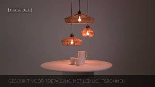 De Lucide hanglamp Yunkai Ø 60 cm 60W natural houtlook is een papieren hanglamp met drie open lampenkappen die op verschillende hoogtes hangen. De totale breedte van de lamp is 60 centimeter en je kunt hem in hoogte verstellen tot maximaal 145 centimeter. Doordat de kappen niet allemaal even groot zijn en op verschillende hoogten hangen, krijgt de lamp een speelse uitstraling. Het gevlochten papier in houtlook laat het licht zacht door en past goed bij natuurlijke materialen zoals hout en planten.