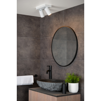 De Lucide plafondspot Taylor 2x5W wit is een badkamerlamp met twee spots die je kunt draaien en kantelen. De spots zitten op één lijn aan een witte plafondplaat en zijn samen 24 centimeter lang, 10 centimeter breed en 12,3 centimeter hoog. De behuizing is van aluminium, dat stevig is en goed tegen vocht kan. Daardoor is deze lamp geschikt voor gebruik in een natte ruimte.