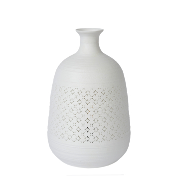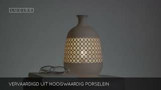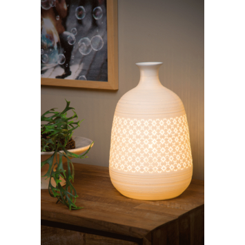 Een toets zachtheid in je interieur bereik je op verschillende manieren, maar geen enkel materiaal dat zo verfijnd is als porselein. Deze tafellamp, Tiesse genaamd, gaven we een extra elegante touch met een vederlicht motief langs waar het licht het armatuur ontsnapt. Door de flesvorm met een diameter van 18,6 centimeter ziet deze tafellamp er retro uit, maar is ze even goed een tof accent in een landelijk of strak modern interieur. Je zet Tiesse eenvoudig aan en uit via de schakelaar in het snoer.