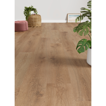 Verrijk je leefruimte met de natuurlijke schoonheid en moderne flair van Lundia's laminaat Robuust Ove. De vloer creëert een verfijnde uitstraling voor je woning die lang mee zal gaan. De laminaatplank met een voelbare houtstructuur heeft een V-groef aan de lange zijde, waardoor het oogt als een authentieke plankenvloer. De vloer beschikt over een klikverbinding, waardoor het leggen van het laminaat eenvoudig gaat en een naadloos effect heeft. Het laminaat kan daarbij zwevend worden gelegd, waardoor deze niet aan de ondervloer hoeft te worden gelijmd. De laminaatvloer is in combinatie met de juiste ondervloer prima geschikt voor eventuele vloerverwarming aan de hand van warmwaterbuizen. Dit kliklaminaat is antislip en biedt daardoor extra stabiliteit en grip om vallen te voorkomen. Een bijkomend voordeel van dit specifieke laminaat is dat de vloer geschikt is voor het gebruik in vochtige ruimtes. Water kan probleemloos op de vloer blijven liggen gedurende een periode van maar liefst 48 tot 72 uur. Laminaat is daarnaast gemakkelijk schoon te maken en daarmee zeer onderhoudsvriendelijk. Het product bevat 6 latten wat leidt tot een totale inhoud van 2.02 m².