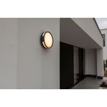 De ronde buitenlamp Rola in het donker grijs met geintegreerde LED en warm wit licht heeft een decoratief frame van aluminium. Een elegante wand-en plafonddecoratie die uw buitenruimtes verlicht.