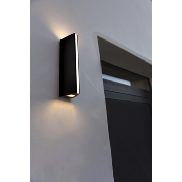 De LUTEC Leo wandlamp is een moderne buitenlamp die design en functie perfect combineert. Met een krachtige lichtbundel omhoog en omlaag en een opalen lichtstrip aan de voorkant zorgt deze matzwarte wandlamp voor een opvallend en sfeervol lichteffect op elke buitenmuur. De behuizing is gemaakt van stevig gegoten aluminium en is IP54-geclassificeerd, wat betekent dat hij bestand is tegen stof en regen. De geïntegreerde LED van 14,5 watt levert warm wit licht (3000K) en is ideaal voor het verlichten van een terras, gevel of oprit. Dankzij zijn slanke vorm en hoogte van 30 cm is de LEO zowel subtiel als stijlvol – zeker als je meerdere exemplaren in een lijn plaatst voor een indrukwekkend visueel effect. De installatie is eenvoudig, en met een energieklasse E werkt hij efficiënt en betrouwbaar het hele jaar door.