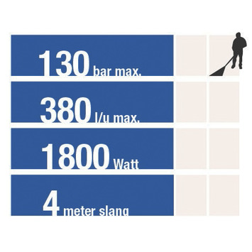 De LUX hogedrukreiniger HD-130/1800 is een krachtig apparaat voor het reinigen van bijvoorbeeld tuinmeubelen, voertuigen, fietsen, oprit, terras of patio. De meegeleverde Patio Cleaner heeft een lans met verstelbare sproeier waardoor je extra snel en moeiteloos kan reinigen van zeer grote oppervlakken, zoals bijv. je terras. Met een vermogen van 1800 Watt en een werkdruk van 130 bar worden voorwerpen en bestratingen grondig gereinigd. De machine heeft een maximale wateropbrengst van 380 liter water per uur en een slanglengte van 4 meter. De hogedrukreiniger is voorzien van 2 transportwielen voor goede mobiliteit tijdens het werken. De ergonomische pistoolgreep zorgt voor een stevige en comfortabele grip. Wanneer je de handgreep loslaat, wordt de waterstraal onmiddellijk onderbroken (Total-Aqua-Stop-Systeem). De LUX hogedrukreiniger HD-130/1800 wordt standaard geleverd met ergonomisch spuitpistool, patio cleaner, vuilfrees en spuitlans. De LUX hogedrukreiniger HD-130/1800 gebruik je voor het moeiteloos reinigen van je voertuigen, patio of terras.