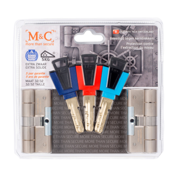 De M&C veiligheidscilinder is een profielcilinder voorzien van zowel het SKG 3-sterren keurmerk als het Politiekeurmerk Veilig Wonen. Producten met het SKG 3-sterren keurmerk zijn zelfstandig in staat het binnendringen van inbrekers met ten minste 5 minuten te vertragen. Hierdoor ben je zeker van een goede beveiliging van het slot. Door de hoge mate van beveiliging is je slot met deze cilinder onder andere goed beveiligd tegen openpikken, de slagmethode, de kerntrekmethode en de breekmethode. Omdat de veiligheidscilinder is voorzien van dit keurmerk wordt deze geadviseerd voor buitendeuren. Voor een optimale veiligheid is de deur dan ook voorzien van een slot en deurbeslag met het SKG keurmerk. De maat van deze cilinder is 32/32 mm wat de meest gangbare maat is zodat deze geschikt is voor de meeste (buiten)deuren van 38 tot 44 mm dikte. Dit artikel wordt geleverd als set van twee gelijksluitende cilinders inclusief 5 sleutels en bevestigingsbouten. Omdat de cilinders gelijksluitend zijn kun je alle deuren met dezelfde sleutel openen, dat is wel zo handig.