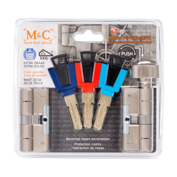 De M&C veiligheidscilinderset bestaat uit een standaard cilinder en een knopcilinder. Zo heb je een complete gelijksluitende set voor bijvoorbeeld de voor- en achterdeur. De cilinders zijn voorzien van zowel het SKG 3-sterren keurmerk als het Politiekeurmerk Veilig Wonen. Producten met het SKG 3-sterren keurmerk zijn zelfstandig in staat het binnendringen van inbrekers met ten minste 5 minuten te vertragen. Hierdoor ben je zeker van een goede beveiliging van het slot. Door de hoge mate van beveiliging is je slot met deze cilinder onder andere goed beveiligd tegen openpikken, de slagmethode, de kerntrekmethode en de breekmethode. Omdat de veiligheidscilinder is voorzien van dit keurmerk wordt deze geadviseerd voor buitendeuren. Voor een optimale veiligheid is de deur dan ook voorzien van een slot en deurbeslag met het SKG keurmerk. De maat van deze cilinder is 32/32 mm wat de meest gangbare maat is zodat deze geschikt is voor de meeste (buiten)deuren van 38 tot 44 mm dikte. Dit artikel wordt geleverd als set met twee gelijksluitende cilinders inclusief 5 sleutels en bevestigingsbouten. Omdat de cilinders gelijksluitend zijn kun je alle deuren met dezelfde sleutel openen, dat is wel zo handig.