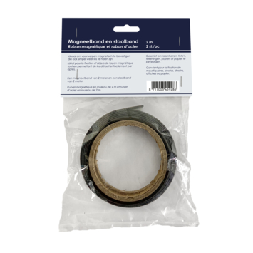 Ontdek de voordelen van de zelfklevende staal- (2000x12,7x1mm) en magneetband (2000x12,7x1.5 mm). Deze zelfklevende rollen zijn ideaal in gebruik om niet magnetische voorwerpen zoals kunststof of aluminium aan metalen oppervlakken te bevestigen. De combinatie tussen het staalband en magneetband zorgt voor een sterkere magnetische werking.
