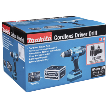 Makita 18V schroef-boormachine met twee 2.0Ah accu's en lader, in een stevige en handige opbergkoffer met een 70-delige set bestaande uit de meest gebruikte accessoires. Deze Makita 18V schroef-boormachine is het perfecte instapmodel voor elke klusser en is geschikt voor regelmatig gebruik. De machine ligt fijn in de hand door de ergonomische handgreep met softgrip, is compact en licht van gewicht, slechts 1,7 Kg. Door de variabele elektrische toerenregeling is de machine perfect af te stellen voor je klus en met het maximale koppel van 42Nm heeft de machine ruim voldoende kracht voor de meeste schroefklussen en boren in hout, metaal, kunststof en zachte steensoorten.