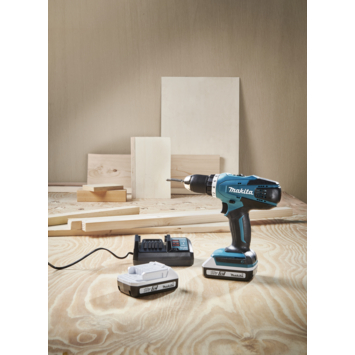 De Makita accu boormachine DF457DWE heeft twee mechanische versnellingen: hoog en laag. Dit maakt hem geschikt voor boren in hout tot 36 mm en in metaal tot 13 mm. In de schakelaar zit een variabele toerenregeling. Je kunt zo rustig starten met schroeven of boren en het voorkomt verspringing van schroeven en zorgt voor een mooiere bewerking. De machine wordt geleverd met twee 1.5Ah accu's die je in 60 minuten op kan laden.