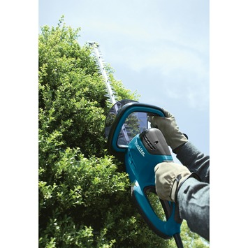 Met het 3-voudige achtergreep is de machine voor links- en rechtshandigen. De neusbeschermstuk beschermt de messen tegen terugslag. Het snoer heeft een lengte van 0.15m en met de kabelgeleider blijft die uit de buurt van de scherpe messen. De messen hebben extra brede aambeelden en dat maakt de machine erg veilig. Met de snelstop wordt de machine binnen 0,2 seconden stopgezet. Voor een veilige machine die zonder moeite je heg snoeit gebruik je de Makita elektrische heggenschaar UH6580.