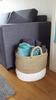 Ik zocht een mand waar ik mijn kleden van de bank in kwijt kon. Ik rol de kleden op en stop ze er rechtop in. Wat ik mooi vind aan de mand is de witte onderrand, dat steekt mooi af bij mijn houten vloer.
