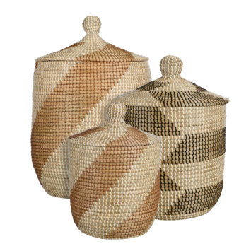 Creëer meer sfeer in je interieur met behulp van deze set opbergmanden. De manden zijn gemaakt van natuurlijk zeegras en voorzien van een trendy motief in de kleuren; bruin, zwart met wit. Leuk om ze bijvoorbeeld ergens in een hoek te plaatsen voor een elegante uitstraling in je interieur. De manden set bestaat uit 3 manden met deksel. De manden meten H45 x ø31 cm, H52 x ø37 cm en H65 x ø45 cm. Ideaal om wat spullen in op te bergen. Waar zet jij deze stijlvolle opbergmanden set neer?