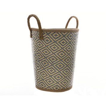 Deze set van ovale manden geweven van palmblad met print 35x30x23 cm zijn decoratieve manden om verschillende spullen in te bewaren. Denk hierbij aan bijvoorbeeld tijdschriften. De mand heeft handvatten waardoor het dragen gemakkelijk is. De set bevat drie verschillende printen, die samen een mooie decoratief geheel vormenvormen. De set is ook verkrijgbaar in de maten 40x35x26 cm en 46x40x30 cm.