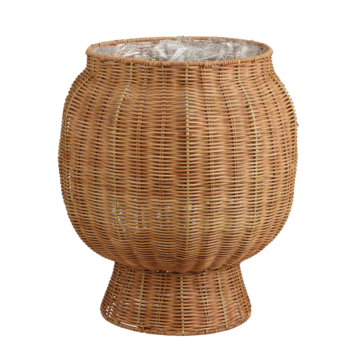 Deze mand van rotan combineert natuurlijke charme met een speels, bolvormig ontwerp. De warme bruine kleur en smalle voet zorgen voor een elegante uitstraling in elk interieur. Gebruik hem als plantenmand met de bijgeleverde plastic binnenvoering of als opberger. Hij staat mooi in de woonkamer, hal of op een overdekt balkon. De afmetingen zijn H47 x ø42 cm.