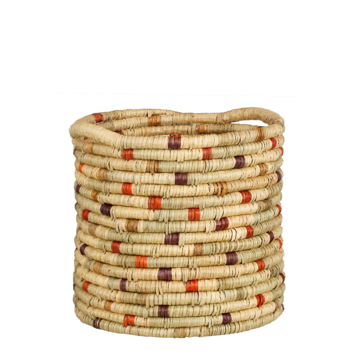 Verbeter de ambiance van je interieur met behulp van deze stijlvolle opbergmand. De mand is gemaakt van zeegras en is leuk afgewerkt met een geblokt gekleurd motief in de kleuren; paars, oranje en bruin. Hij is prachtig geweven en dankzij de handvatten kun je de mand eenvoudig verplaatsen. De mand is H32 x ø33 cm groot.