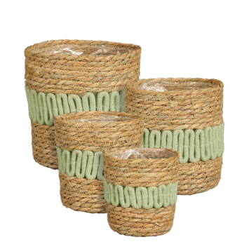 Deze set plantenmanden geeft je interieur een natuurlijke en speelse uitstraling. De manden zijn gemaakt van een mix van zeegras, polyester en katoen in een warme bruine kleur, afgewerkt met een opvallende lichtgroene band als accent. Perfect om jouw favoriete planten een gezellige bohemian touch te geven. Plaats de set als geheel bij elkaar of verspreid de manden over verschillende ruimtes! De afmetingen zijn H12 x Ø13 cm, H14 x Ø15 cm, H16 x Ø17 cm en H18 x Ø19 cm.