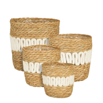 Deze set plantenmanden geeft je interieur een natuurlijke en speelse uitstraling. De manden zijn gemaakt van een mix van zeegras, polyester en katoen in een warme bruine kleur, afgewerkt met een opvallende witte band als accent. Perfect om jouw favoriete planten een gezellige bohemian touch te geven. Plaats de set als geheel bij elkaar of verspreid de manden over verschillende ruimtes! De afmetingen zijn H12 x Ø13 cm, H14 x Ø15 cm, H16 x Ø17 cm en H18 x Ø19 cm.