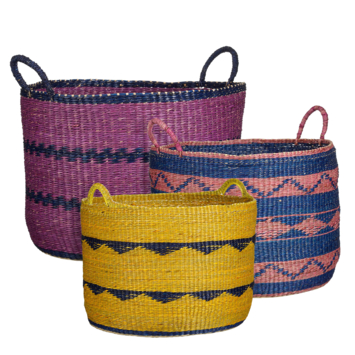 Breng kleur en stijl in je huis met deze prachtige set van drie opbergmanden! Ze zijn mooi in elkaar geweven met zeegras in een opvallende kleur. De set bestaat uit drie verschillende formaten en kleuren. Perfect voor als je verschillende spullen wil opbergen; van speelgoed tot plaids! Elke mand heeft twee handvatten, waardoor je ze gemakkelijk verplaatst. Daar komt bij dat ze door de kleuren een eyecatcher zijn. Leuk voor in een kinderkamer met een thema of gewoon in je woonkamer! De grote paarse mand heeft de afmetingen H38 xø53 cm, de middelste blauw met roze mand heeft de afmetingen H36 xø49 cm en de kleine gele mand heeft de afmetingen H34 xø45 cm .