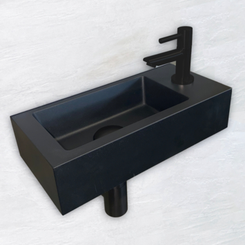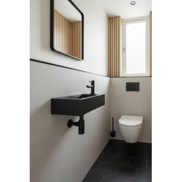 Met deze mat zwarte fonteinset haal je een strakke, moderne look in huis. De keramische fontein is klein van formaat, en dankzij het kraangat en plateau aan de rechterkant past hij goed bij een rechteropstelling. De mat zwarte kraan heeft een lange hendel en is makkelijk in gebruik. De bijpassende sifon is laag van model, waardoor je voldoende beenruimte houdt. Ook de vaste waste heeft dezelfde mat zwarte afwerking en blijft standaard open. Daardoor is deze set geschikt voor fonteinen zonder overloop. Alles is perfect op elkaar afgestemd; niet alleen qua kleur, maar ook qua formaat. Zelfs het montagemateriaal zit erbij, zodat je meteen aan de slag kunt. Ideaal als je een nette afwerking wilt zonder losse onderdelen bij elkaar te zoeken.