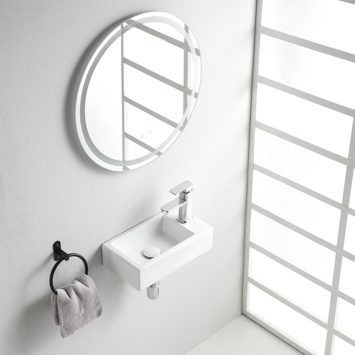 Een compacte fontein die je makkelijk kwijt kunt in kleine ruimtes: deze Ondine M past dankzij z’n formaat van 40 x 22 cm zelfs in een smal toilet. De strakke, rechthoekige vorm geeft een moderne uitstraling en het glanzend witte keramiek oogt fris en blijft lang mooi. Je kiest zelf de kraan, sifon en waste die je erop aansluit, dus je kunt het fonteintje helemaal aanpassen aan jouw stijl. Deze versie heeft de kraangatpositie aan de rechterkant. Handig als je leidingwerk zich rechts van het fonteintje bevindt. Let op: deze fontein heeft geen overloop. Gebruik daarom een vaste waste, zodat er geen water blijft staan. Dankzij het gladde oppervlak is schoonmaken zo gebeurd en blijft je toiletruimte hygiënisch en netjes.