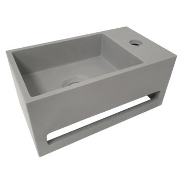 Deze betonlook fontein met kraangat rechts is praktisch én stijlvol. De uitsparing onderaan biedt ruimte voor een handdoek, zodat je na het wassen meteen kunt afdrogen. De fontein is gemaakt van solid surface: slijtvast, vochtbestendig en eenvoudig schoon te houden. Bacteriën krijgen nauwelijks kans dankzij het gladde oppervlak. Je kunt zelf kiezen welke kraan, waste en sifon je erbij gebruikt. Let op: bij fonteinen zonder overloop wordt een vaste waste aangeraden. De afmetingen van 35 x 20 x 16 cm maken deze fontein geschikt voor compacte toiletruimtes. De betonlook zorgt voor een stoere, neutrale uitstraling die goed te combineren is met verschillende stijlen.