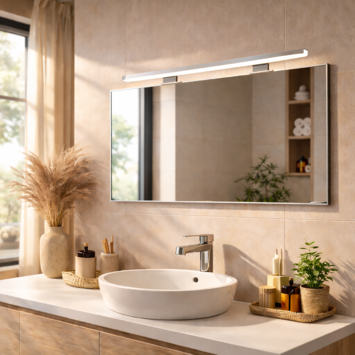 Zoek je een krachtige lamp voor boven je badkamerspiegel? Deze Syrin ledverlichting van 800 mm geeft helder en neutraal wit licht (4000 kelvin), waardoor je alles goed ziet. Ideaal voor dagelijks gebruik in de badkamer. De lamp is 800 mm breed en bevat een geïntegreerde led van 13 watt. De lichtbundel is breed, met een stralingshoek tussen 41 en 80 graden. Daardoor verlicht je een groot oppervlak zonder harde schaduwen. Je monteert de lamp direct op een spiegel of kast met een bovenrand van minimaal 15 mm. De steun klik je eenvoudig vast. De transformator is al in de lamp verwerkt, dus je sluit ’m rechtstreeks aan op 220 volt. De behuizing is gemaakt van kunststof in een chroomkleur, met een opalen kap die het licht gelijkmatig verdeelt. Dankzij de spatwaterdichte afwerking werkt de lamp probleemloos in een vochtige ruimte.
