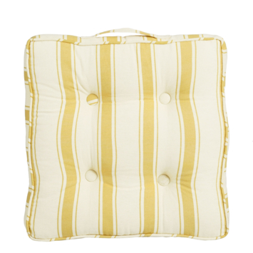 Het speelse oker-witte streepmotief geeft het kussen een vrolijke uitstraling, die je ruimte direct opfleurt. De handige handgreep maakt het kussen eenvoudig te verplaatsen, zodat je het overal kunt gebruiken waar je maar wilt. Dankzij de vier knopen blijft de vulling goed op zijn plek en behoudt het kussen zijn mooie vorm, zelfs na veelvuldig gebruik.