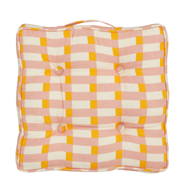 Het speelse oranje-witte motief brengt direct kleur en levendigheid, wat je omgeving een vrolijke uitstraling geeft. De handige handgreep maakt het verplaatsen van het kussen eenvoudig, zodat je het snel kunt gebruiken waar je het nodig hebt. Dankzij de vier knopen blijft de vulling gelijkmatig verdeeld en behoudt het kussen zijn vorm, ook na veelvuldig gebruik.