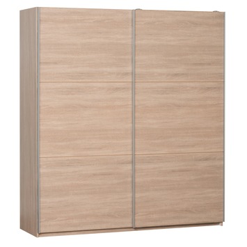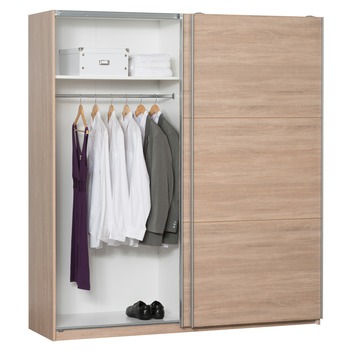 De Max zweefdeurkast (hxbxd) 200x180x60 cm in het houtdecor eiken is een fraaie, eigentijdse kast met soepel lopende zweefdeuren. Deze kast is verkrijgbaar in drie breedte-maten 120 cm, 150 cm of 180 cm. De kast is uitgevoerd met een moderne strak gevormde aluminium greeplijst die voorzien is van een stofstrip. De stofstrip zorgt ervoor dat er zo min mogelijk stof in de kast komt. De kastombouw is in dezelfde kleur als de zweefdeuren eiken en is opgedeeld in twee delen met elk een legplank en een kledingroede. Deze indeling is uit te breiden met een legplankenset van drie stuks en een ladeblok met twee of drie laden voor optimaal opberggemak. De Max zweefdeurkast ook verkrijgbaar in twee moderne houtdecoren: wit met houtnerf en ijswit grenen.