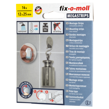 MEGASTRIPS voor het bevestigen van kleine voorwerpen op gladde oppervlakken binnenshuis. De montagestrips hebben een hoge kleefkracht aan beide zijden en kunnen worden verwijderd zonder resten achter te laten. Ze zijn vochtbestendig en daardoor tevens geschikt voor gebuik in de badkamer.
