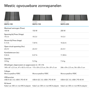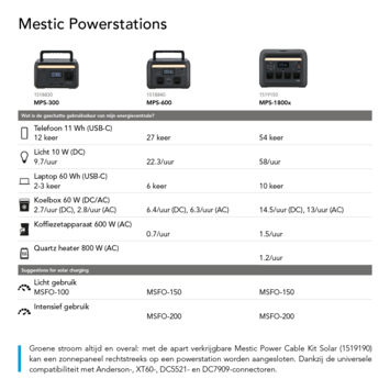 Met de Mestic Power Cable Kit Solar koppel je een zonnepaneel direct aan je powerstation. Zo laad je je powerstation op met zelf opgewekte stroom of gebruik je die energie meteen voor je apparaten. Ideaal wanneer je buiten bent en toch stroom wilt gebruiken.