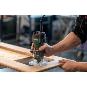 Lichte, compacte kantenfrees voor het eenhandig profielfrezen, trimmen en groeffrezen Krachtige motor voor het snel frezen van hout en vergelijkbare materialen Uitgebreid pakket met: parallelgeleider, kopieerflens en rollengeleiding Exacte, traploze instelling van de diepte en vastzetten van de motoreenheid met een tandheugel Transparante grondplaat voor maximaal zicht op het frezen en het werkstuk Herstartbeveiliging: voorkomt het per ongeluk starten van de machine na stroomonderbreking Afschakelkoolborstels voor de bescherming van de motor