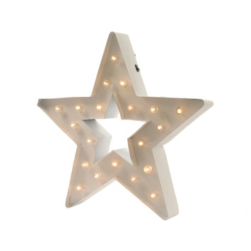 Ster van metaal in een verouderd witte kleur met 20 LED lampjes werkend op 2 AA batterijen (batterijen AA zijn niet bijverpakt). Geeft een extra sfeer op een slaapkamer, in de woon- en/of eetkamer. Afmeting Ø 37,5 cm.