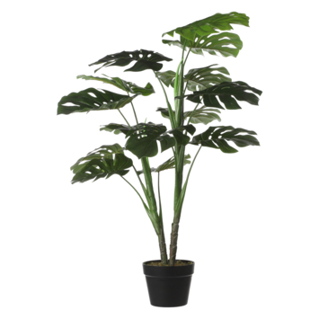 Klaar om zorgeloos te genieten? Deze kunstplant is niet van echt te onderscheiden, maar heeft geen enkel onderhoud nodig. De Monstera wordt ook wel gatenplant genoemd staat bekend om de grote bladeren met gaten. Het blad is uitgevoerd in verschillende maten en groentinten voor een natuurlijk effect en brengt gelijk een botanische sfeer in huis. De plant is stevig verankerd in een zwarte kunststof pot, maar moet voor gebruik wel nog in model worden gebracht. Vuistregel: het blad moet je aankijken! Zet hem na het uitvouwen zo neer, of gebruik de kunststof pot als stevige basis voor een sierlijke overpot. Combineer hem met andere kunstplanten en -bloemen en breng meer groen in huis. De Monstera is ongeveer 1 meter hoog en heeft een diameter van 70 cm.