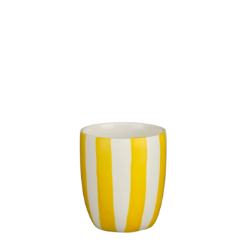 Voeg extra flair toe aan je tafelsetting met de geel-wit gestreepte beker. De schattige mok is gemaakt van steengoed en is bestend tegen de vaatwasser en magnetron. Hierdoor is hij erg geschikt voor dagelijks gebruik. Hij heeft een hoogte van 7 cm en een diameter van 8,5 cm.
