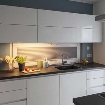 De Calina Switch Tone DIM 60 LED-onderkastarmatuur zorgt voor optimale lichtomstandigheden en maximaal lichtcomfort in de keuken. Dankzij de Switch Tone-technologie kan het LED-licht traploos van kleur veranderen door simpelweg aan de schakelaar te draaien.Terwijl gezellig warm wit licht uitnodigt om te ontspannen, is koel wit daglicht ideaal als werklamp. Zo stel je precies de juiste lichttoon in voor elke stemming. Door opnieuw te drukken en te draaien, dimt het armatuur ook in de laatst geselecteerde lichtkleur, zodat je de helderheid van het licht kunt aanpassen aan behoefte. Ook de memory-functie, die de laatst geselecteerde lichtkleur en dimniveau opslaat, zorgt voor nog meer comfort. lade of kast hebt geïnstalleerd en trek je hem eruit of open je de deur. De lamp heeft een geïntegereerde ledlichtbron van 8 watt met een lichtopbrengst van 420 lumen.