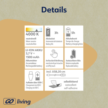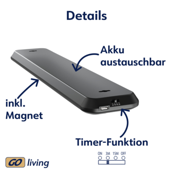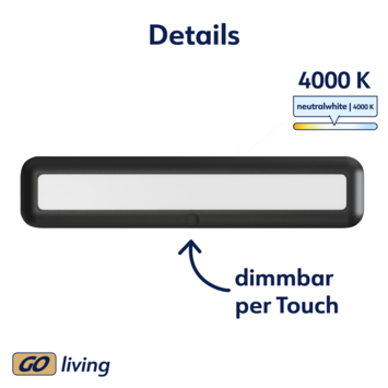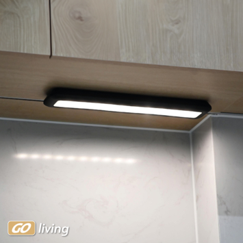 Mobina Push 30 is een zwarte onderbouwlamp van Müller-licht, ideaal voor bijvoorbeeld onder je keukenkastjes. De draadloze lamp heeft een ingebouwde ledlichtbron van 2 watt die zorgt voor een koel wit licht met een lichtopbrengst van 200 lumen. De installatie is eenvoudig door een zelfklevende strip.Je kunt de lamp aan- en uitzetten met de grote schakelaar. Aan de zijkant van de lamp is er nog een schakelaar waarmee je de automatische uitschakeltijd kunt instellen: 3 of 15 minuten. Mobina Push 30 is oplaadbaar via de meegeleverde USB-kabel. Volledig opgeladen kan de lamp tot 3 uur branden. De laadtijd bedraagt ook 3 uur.