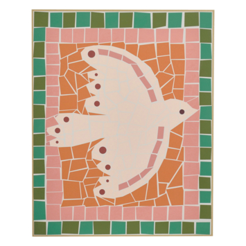 Deze speelse muurdecoratie toont een sierlijke vogel in mozaïekstijl, omlijst door roze, oranje en groene vlakken. De beige basis zorgt voor rust, terwijl de kleuren voor een levendig geheel zorgen. Perfect voor een kinderkamer, creatieve hoek of als vrolijk accent in een modern interieur. De combinatie van vormen en tinten geeft een handgemaakte uitstraling. De afmetingen zijn L40 x B50 x H3 cm.