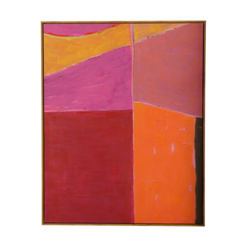 Dit moderne en abstracte kunstwerk voegt een vrolijk en warm gevoel toe aan je interieur. Het bevat meerdere fleurige kleuren zoals roze, paars, geel en oranje. De strakke lijnen zorgen voor een georganiseerde, maar toch speelse uitdrukking. Deze muurdecoratie is gemaakt van canvas en heeft een afmeting van L80 x B100 cm. De muurdecoratie is daarnaast gemaakt van FSC®-gecertificeerd hout.