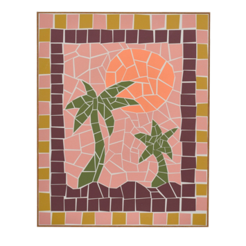 Deze muurdecoratie in mozaïekstijl brengt direct een zomerse sfeer in huis. Het kleurrijke ontwerp met twee palmbomen en een warme zon op een achtergrond van roze, oker en paars maakt elke muur levendig. Perfect voor een speels accent in de woonkamer, gang of kinderkamer. De combinatie van tinten en vormen geeft het geheel een handgemaakte uitstraling. De afmetingen zijn L40 x B50 x H3 cm.
