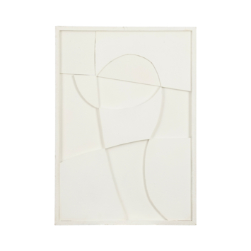 Met dit geometrisch abstracte kunstwerk aan je muur verfraai je niet alleen je woonkamer, het is ook nog eens een interessant gespreksonderwerp. Iedereen ziet er wel iets anders in terug. De muurdecaoratie is gemaakt van stevig MDF. Door het creëren van reliëf waarbij verschillende vlakken gebruikt zijn springt het zeker in het oog. De neutrale witte kleur voorkomt dat het niet storend overkomt. Hij heeft een afmeting van L50 x B70 cm en is daarnaast gemaakt van FSC®-gecertificeerd materiaal.