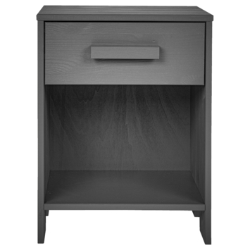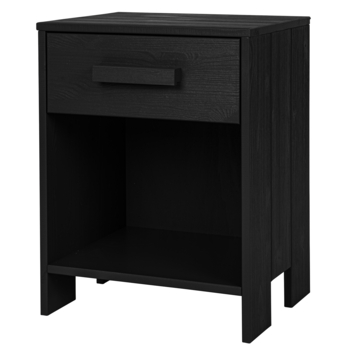 Dit eigentijdse Dennis nachtkastje heeft een stoer uiterlijk. Het Dennis nachtkastje komt uit de collectie van het Nederlandse merk WOOOD. Het nachtkastje heeft een ingebouwde lade en is daaronder voorzien van een open ruimte. Handig voor het opbergen van spullen die niet gezien mogen worden, maar ook voor tijdschriften of boeken in de open ruimte. Het nachtkastje is gemaakt van, FSC gecertificeerd, grenenhout in een zwarte kleur en heeft een geborstelde afwerking. Handig naast het bed!