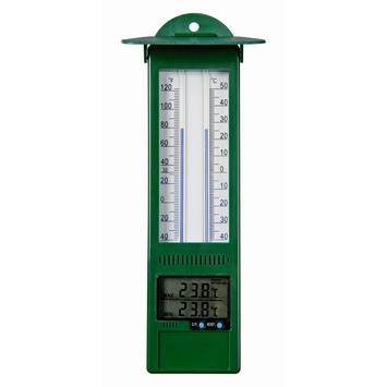 De Nature buitenthermometer analoog/digitaal voor het meten van de buitentemperatuur. De groene kunststof thermometer heeft zowel een analoge als digitale aanduiding van de temperatuur. Met een lengte van 24 centimeter en een breedte van 9,5 centimeter is de thermometer een mooie versiering aan de buitenmuur. Om te zorgen dat de thermometer de buitentemperatuur zo reëel mogelijk weergeeft, moet je zorgen dat de thermometer op de juiste plaats wordt bevestigd; vol in de zon of schaduw kunnen de gegevens namelijk beïnvloeden.