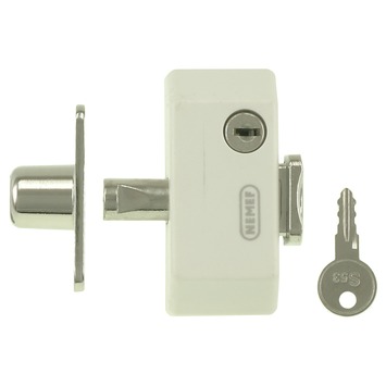 De Nemef druksluiting raam SKG1 wit is een afsluitbare druksluiting voor het beveiligen van je draairamen, bovenlichten, schuifpuien en/of klepramen uitgevoerd in de kleur wit. De druksluiting heeft naast het Politiekeurmerk Veilig Wonen een SKG1 keurmerk. Producten met SKG1 zijn in combinatie met andere inbraakwerende voorzieningen ten minste 3 minuten inbraakwerend. Kan zowel links als rechts op je raam geplaatst worden. Voor naar binnen draaiende ramen: pas je de speciale sluitplaat P2565/12 toe. Verpakt per stuk, inclusief bevestigingsmateriaal, sleutel en montagehandleiding.