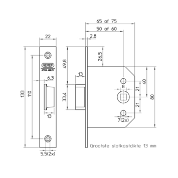 Het Nemef loopslot binnendeur 55-50mm is een eenvoudig slot dat niet afsluitbaar is. Geschikt voor vervanging van je bestaande sloten met deze afmeting. Dit eenvoudige slot kan op een naar binnen- of naar buitendraaiende deur zowel links als rechts geplaatst worden. De voorplaat is 133mm lang en de slotkast is circa 75mm bij 80mm. Verpakt per stuk inclusief sluitplaat, bevestigingsmateriaal en een duidelijke montagehandleiding.