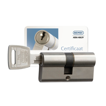 Door de SKG***®, waarmee de Nemef veiligheidscilinder 132/9p is voorzien, is deze zeer geschikt voor toepassing binnen het Politiekeurmerk Veilig Wonen. Een extra zekerheid; door het technisch patent zijn de sleutels niet na te maken. Doormiddel van de bijgeleverde kaart is het wel eenvoudig originele sleutels en cilinders na te bestellen. Met deze hoogwaardige Nemef cilinder geef je inbrekers minder kans om je deur open te breken, mede dankzij kerntrekbeveiliging en de uitgebreide bescherming van de cilinder tegen uitboren. De gevarenfunctie van deze Nemef cilinder zorgt ervoor dat je deur ook te openen is wanneer er aan de andere zijde al een sleutel zit. De Nemef 132/9P veiligheidscilinder is verkrijgbaar in gelijksluitende sets (per 2, 3 en 4 stuks), zodat je slecht 1 sleutel nodig hebt om al je deuren te openen. Deze set wordt geleverd met 6 sleutels.