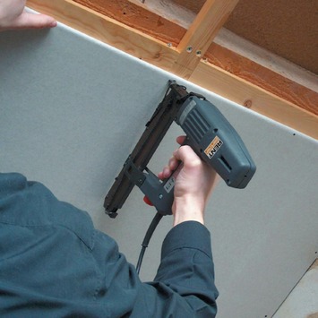 Met het nietapparaat kan je schroten, gipsplaten, plafondtegels en glaslatten bevestigen. De slagkracht van het apparaat is instelbaar en ook is het apparaat uitgerust met een naslagmogelijkheid. Voor veiligheid wordt aanbevolen: oogbescherming. Karwei werkt samen met RentPartner voor het verhuren van Gereedschap